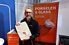 Jernia-sjef Espen Karlsen viser fram gjenvunnet porselen på kjedens stand på Handelskonferansen.