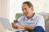 Man in living room with laptop and credit card smiling